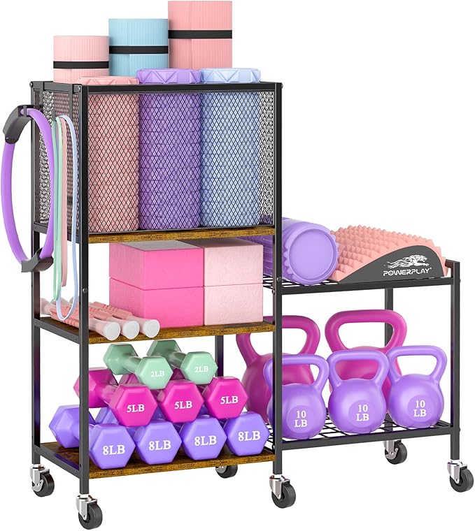 - 【Sturdy and Durable】The combination of high quality wood and metal increases the sturdiness and durability of this fitness equipment storage rack so that you can store approximately 65 pounds of weight on each shelf. Also, 6 metal wheels add great stability to this yoga rack while on the move.