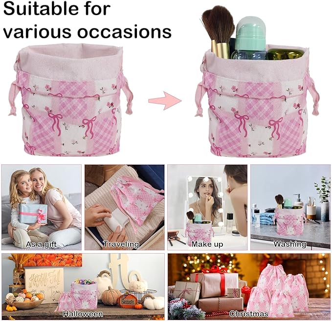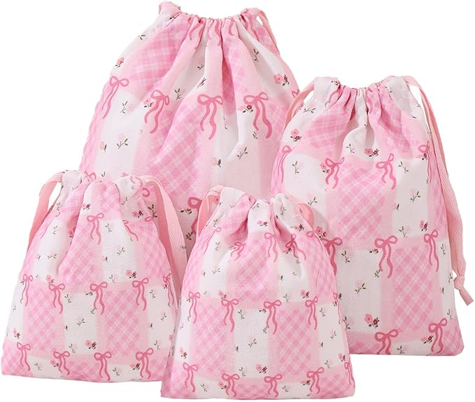 LYDZTION 4pcs Floral Drawstring Makeup Bags Pouches For Purse, Small Canvas Cloth Gift Bags Pouch For Cosmetics Jewerlry Home Travel Storage,Flower Bow