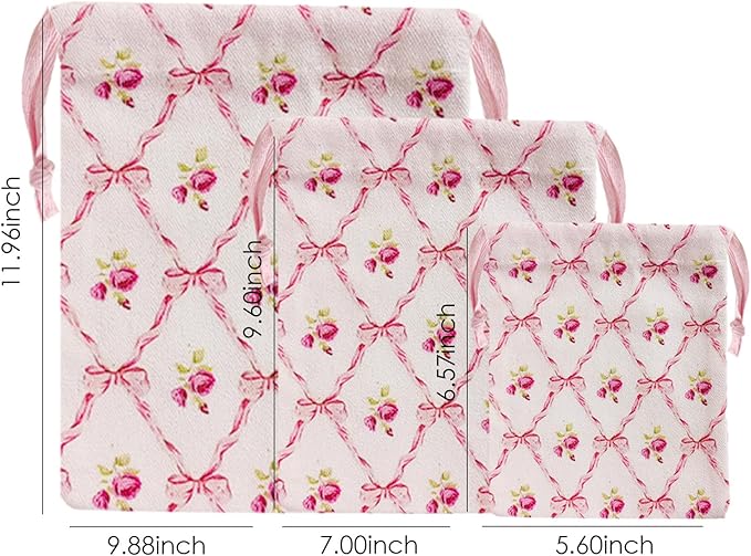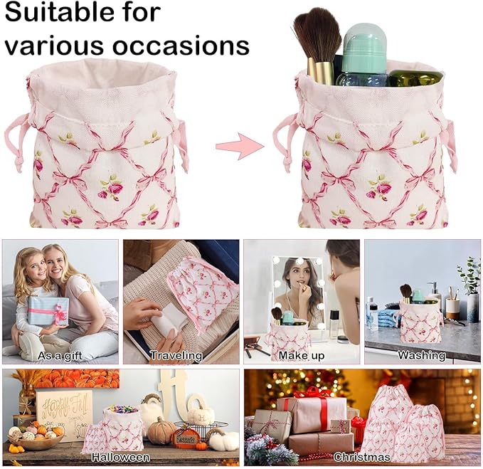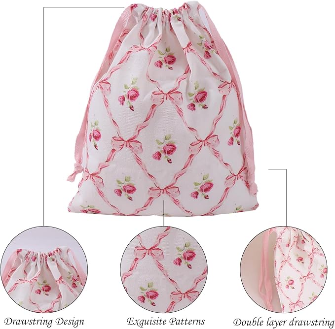 LYDZTION 4pcs Floral Drawstring Makeup Bags Pouches For Purse, Small Canvas Cloth Gift Bags Pouch For Cosmetics Jewerlry Home Travel Storage,Rose Bow