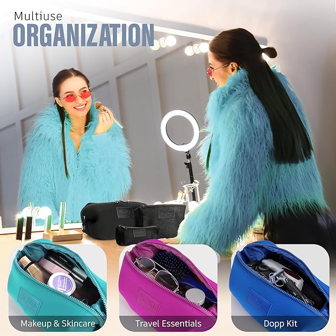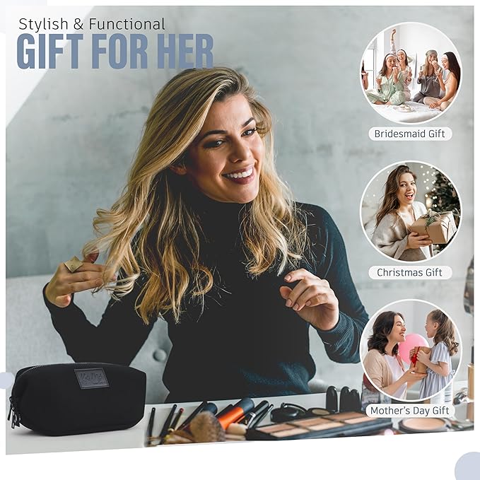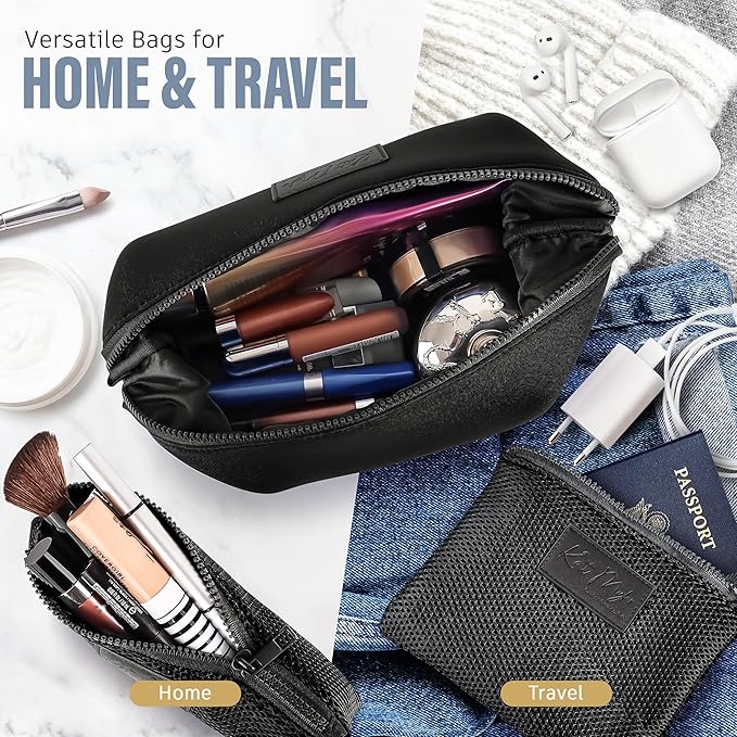 - Durable and Long-Lasting: The neoprene material ensures durability and versatility for modern travel needs and everyday use. Compact and portable cosmetic bag: The sleek design makes it easy to carry your makeup and cosmetics while traveling.