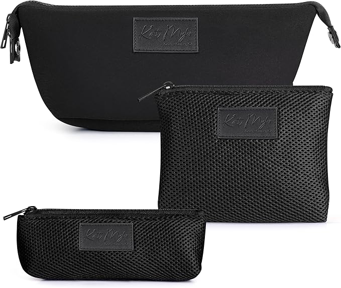 Kat Myhr Neoprene Washable Travel Makeup & Cosmetic Bag Set, 2 Air Mesh Pouches,100% Neoprene Toiletry Bag, Large Water Resistant Travel Bag for Toiletries, Makeup Cosmetic Travel Bag (Jet Black)