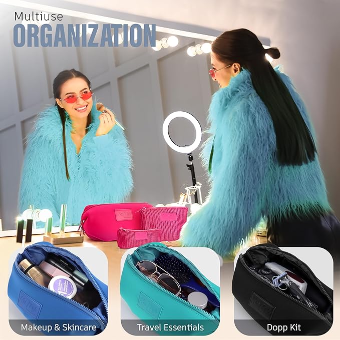 - Durable and Long-Lasting: The neoprene material ensures durability and versatility for modern travel needs and everyday use. Compact and portable cosmetic bag: The sleek design makes it easy to carry your makeup and cosmetics while traveling.