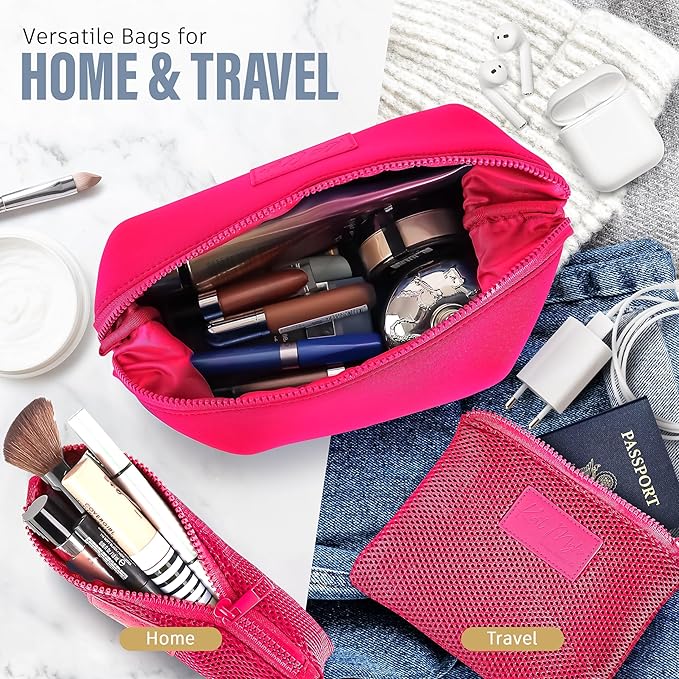 Kat Myhr Neoprene Washable Travel Makeup & Cosmetic Bag Set, 2 Air Mesh Pouches,100% Neoprene Toiletry Bag, Large Water Resistant Travel Bag for Toiletries, Makeup Cosmetic Travel Bag (Fuchsia Pink)