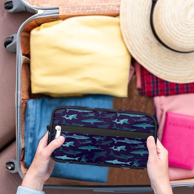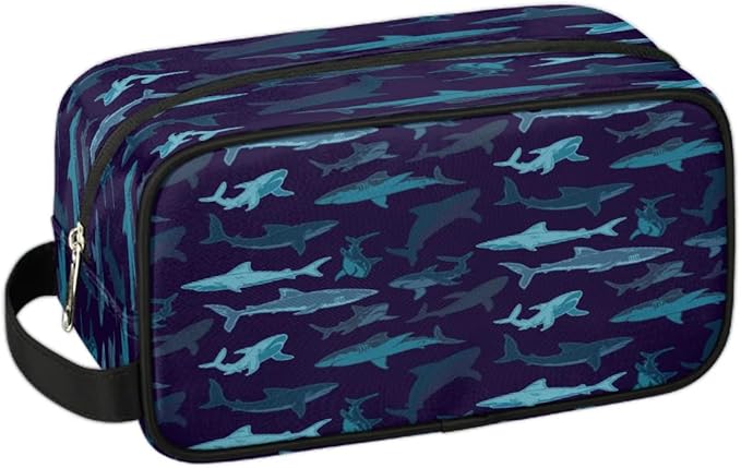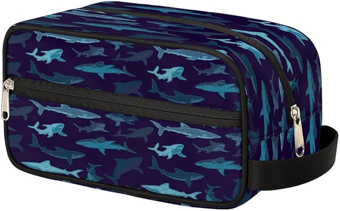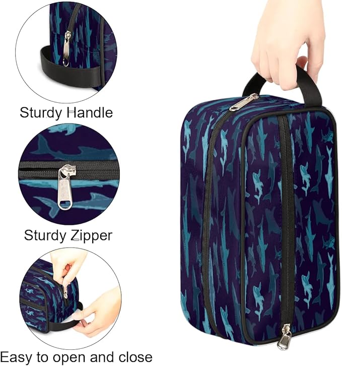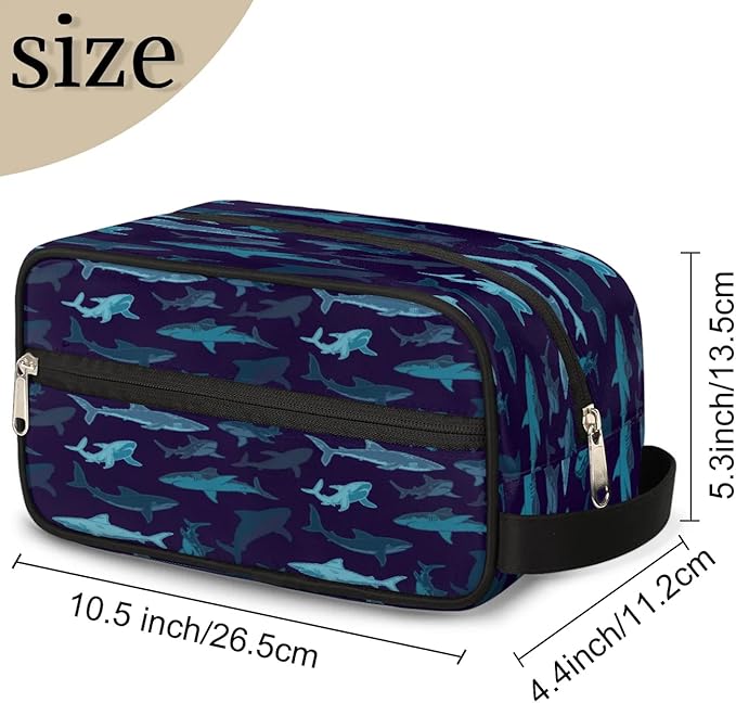 - 【Large Capacity Hanging Toiletry Bag】The navy blue shark makeup bag for boys mens has a large main zipper compartment for storing all other small items needed,such as cosmetics,razors,travel toiletries,etc;The outer layer has a zippered small pocket suitable for storing cash,cards,passports,phones,snacks,and other small items that can be conveniently carried around.