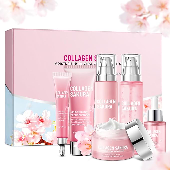 Sakura Skin Care Set for Teen Girls, Cherry Blossom Skincare Gift Set for Teens & Women, Moisturize & Repair Skin, 6 Pcs Collagen Skin Care Kits with Cleanser, Toner, Lotion, Serum, Cream & Eye Cream
