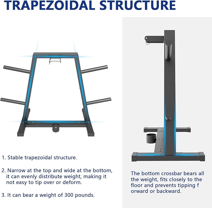 - Durable and sturdy construction: Made with durable steel and featuring a black powder coat finish, our weight plate rack offers a sturdy and long-lasting solution for storing your weights. It has 4 posts and 1 weight bar holder, perfect for standard plates with a 1-inch center hole. With a maximum weight capacity of 300 pounds, it can easily accommodate your weightlifting needs.