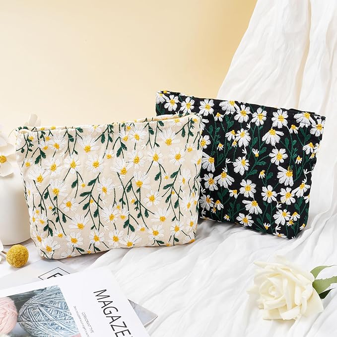 - Durable and Stylish: Made of soft fabric with canvas lining, our cute makeup bag are not only durable but also full of fashion sense.The unique embroidered daisy design makes the medium cosmetic bag more beauty and elegant that will complement your personal style.The sturdy zipper closure design ensures the security of your cosmetics.