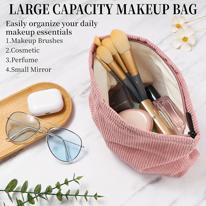 WOZEAH Corduroy Makeup Bag for Purse Small Cosmetic Pouch,Stylish Zipper Make up Pouch Travel Canvas Toiletry Bags(Corduroy Pink)
