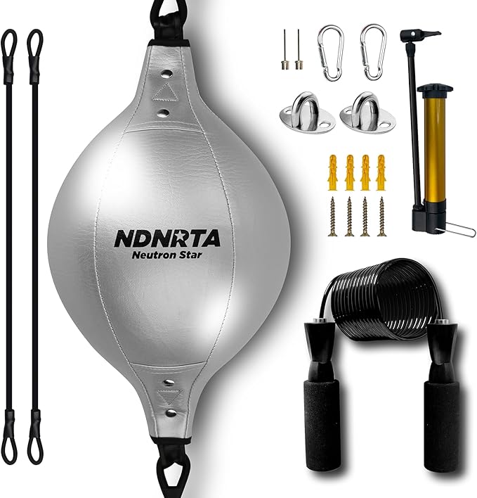 - [Upgraded Double End Punching Bags] All new NDNRTA professional punching bag to improve reaction speed for boxing, MMA, Muay Thai and other punching training. It features convenient and safe design with super elastic rope and ring locks for quick installation in gym and home.