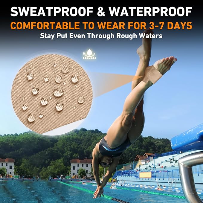 - UPGRADED WATERPROOF & BREATHABLE MATERIAL - Features an enhanced design that fits the skin better and increases durability, outperforming other sports tapes. This advanced material ensures long-lasting adhesion, even in wet conditions, while allowing the skin to breathe, making it ideal for extended wear and intense physical activity.