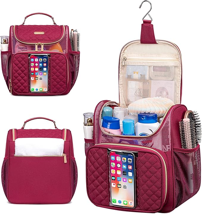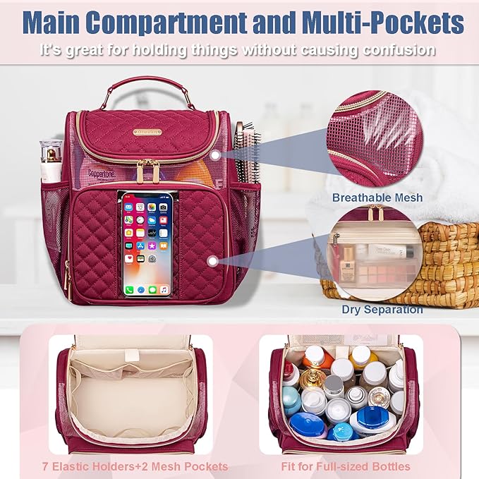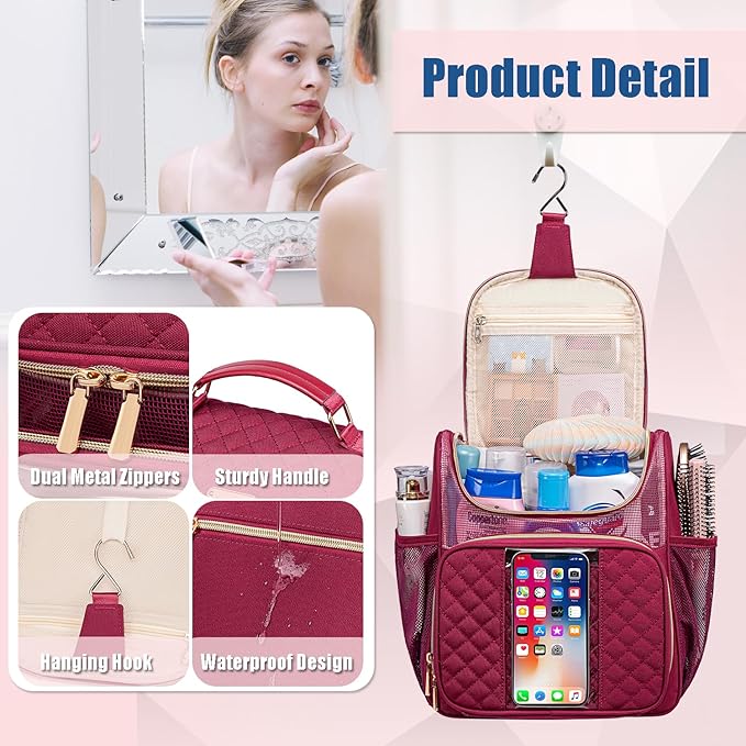 - Toiletry Bag for Women with Compartments - Toiletry organizer features multiple compartments and holders for optimal organization. It has 1 main compartment, 4 zipper pockets for smaller items, and the interior of the large makeup bag contains 7 different sizes of elastic straps for holding toothbrushes, facial cleansers, bottles, and more. There are also mesh pockets on both sides for additional storage and a waterproof phone bag for convenience.