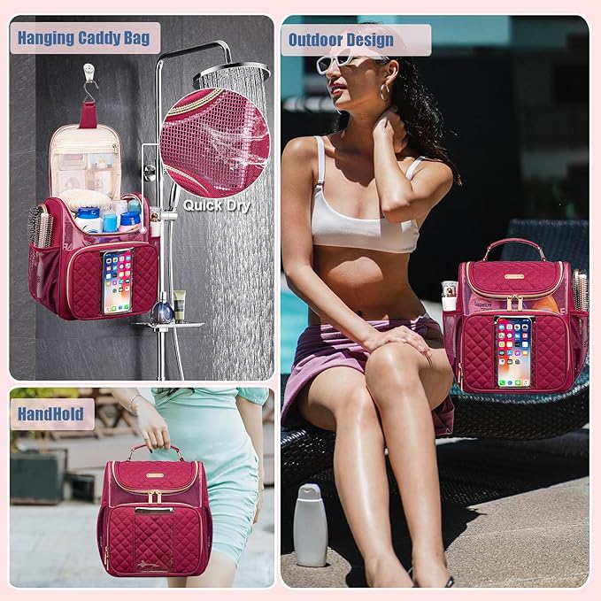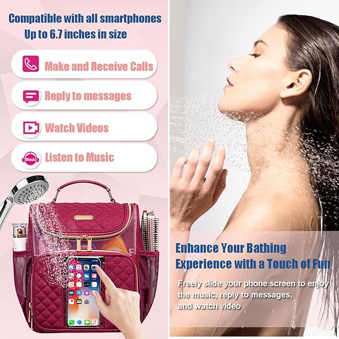 - Travel Toiletry Bag with 2-in-1 Front Pouch - The portable shower caddy's front pouch is not just for small items. It's also a phone holder. With the waterproof layer, you can control your phone's screen. Listen to music, send emails or watch videos. No more missing important calls or messages. A great 2-in-1 feature for staying connected in the shower or while getting ready.