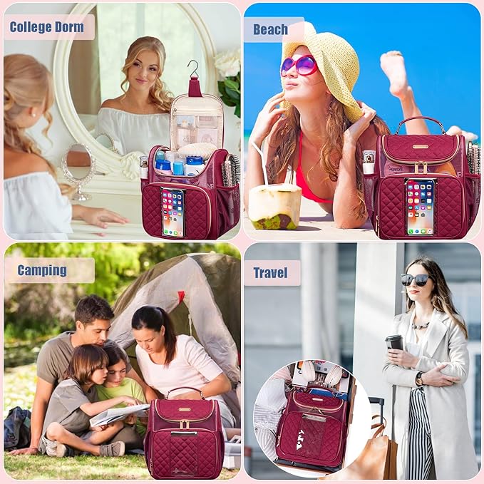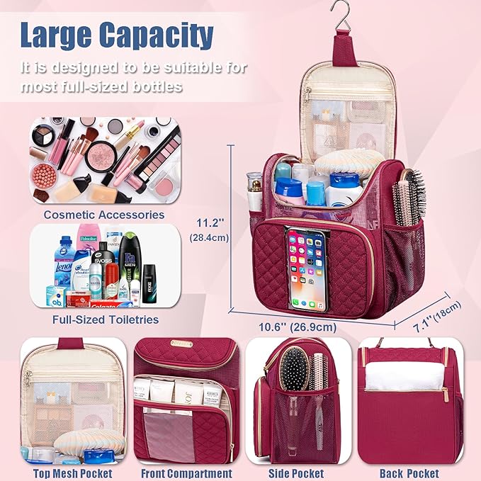 - Hanging Toiletry Bags for Organization - Portable shower caddy bag has an upgraded size of 12.2'' x 11.2'' x 7.1'' (L x H x W), Travel toiletry bag for women providing ample room to store towels, toiletries, and beauty products. bathroom caddy bag with its generous space, it helps keep your bathroom clutter-free and orderly. It can easily accommodate full-sized bottles and a variety of items, ensuring you have everything you need within reach.