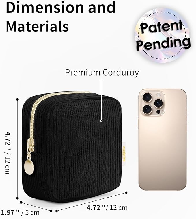 Wandering Nature Small Makeup Bag for Purse Mini Make up Pouch Cute Cosmetic Pouch for Women with Slip-in Pockets Corduroy, Black