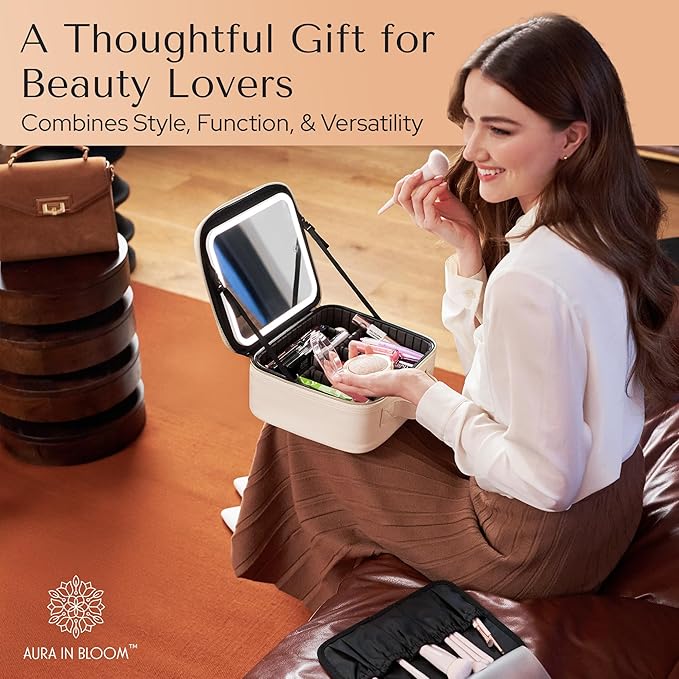 - DURABLE, TRAVEL-FRIENDLY & STYLISH: Designed for make up lovers on the move, this travel makeup bag is crafted from water-resistant PU leather for durability. Sturdy zippers and a trolley sleeve allow easy luggage attachment, making it ideal for vacations, business trips, or daily use. The lighted makeup case's compact size ensures convenience without compromising storage space.