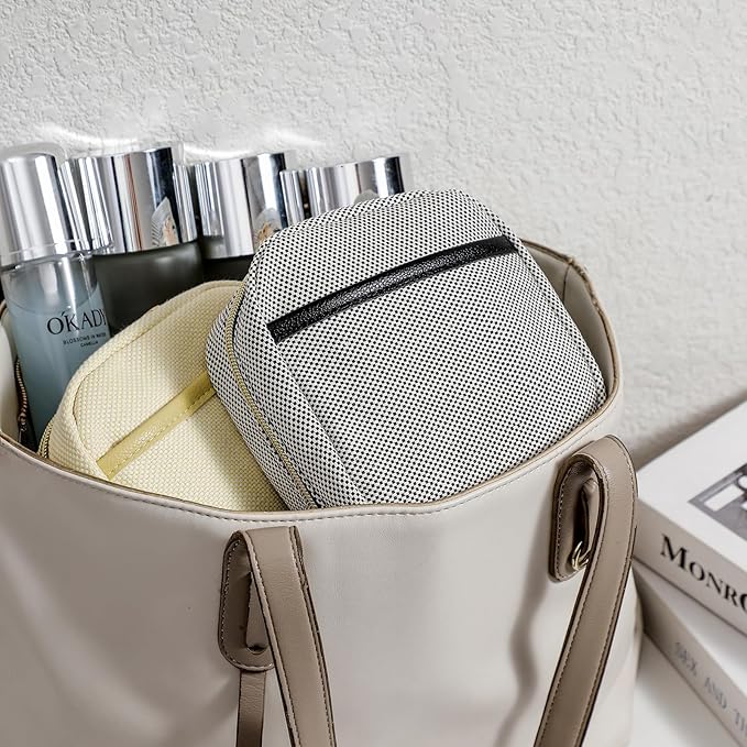 - [Practicality Makeup Bag Design]: Small makeup bag incorporates two design principles: organized storage and easy access. The first concept involves five pockets and three stretch slots within the cosmetic bag, facilitating effortless organization of small items. The second idea centers around a larger opening, allowing users to retrieve and replace items with ease.