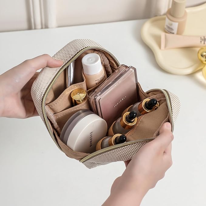 Small Canvas Makeup Bag with Compartments for Purse, Wide-open Makeup Pouch with Zipper and Keychain, Key Pocket Lipstick Bag Travel Organizer Bag(01Beige)
