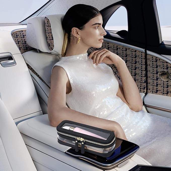 Makeup Brush Case Clear Travel Cosmetic & Toiletry Bag Slim Makeup Bag with Zipper Small Purse Organizer Car Essential Bag for Women (Black, SLIM-1)