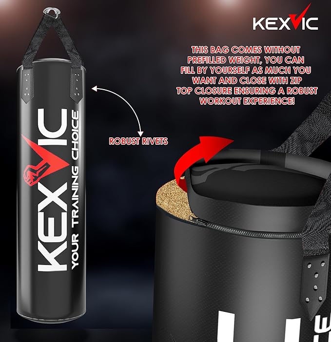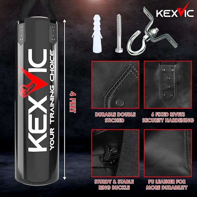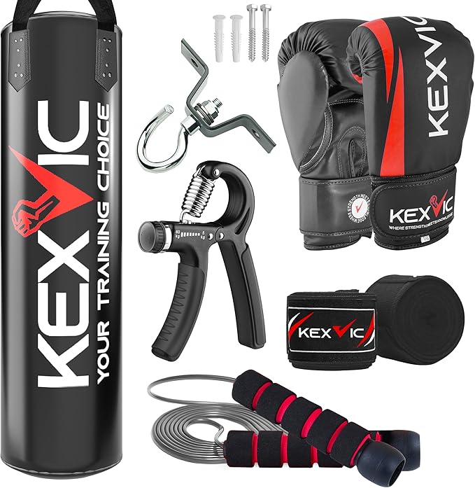 - Value Boxing Gear Accessories : This Boxing Set Includes 1 x 4FT Unfilled Hanging Punching bag, 1 x Pair of KEXVIC 12OZ Boxing Training Gloves, 1 x Pair of Hand Wraps, 1 x Jumping Skipping Rope, 1 x Hands Gripper, 1 x Ceiling Hook with Swivel and Hanging Straps for the Heavy Punching Bag