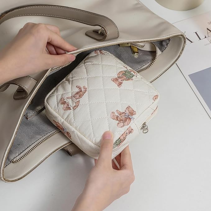 Small Quilted Cotton Makeup Bag for Purse, Cosmetic Bag with Compartments, Cotton Aesthetic Makeup Bag, Travel Toiletry Pouch, Key Pocket Lipstick Bag Card Holder Data Cable Organizer(01White Bear)