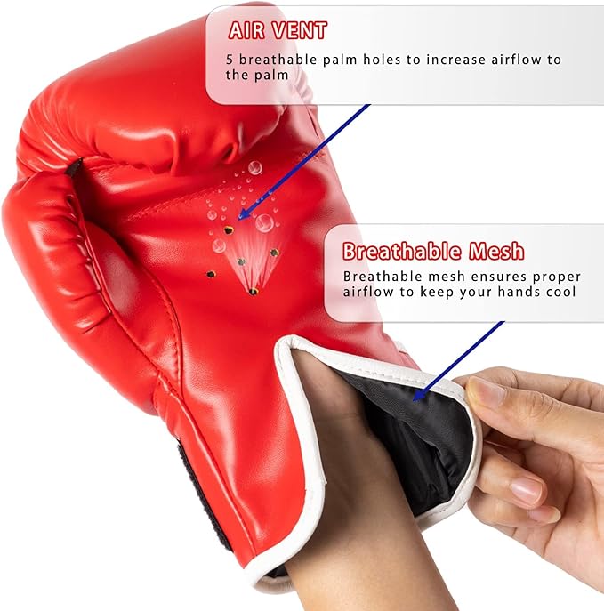 - 【CAREFUL PROTECTION】Safe one piece design of the wrist and back of the kids boxing training gloves, thickened thumb and plump fist peak carefully protects your kids' hands in all directions