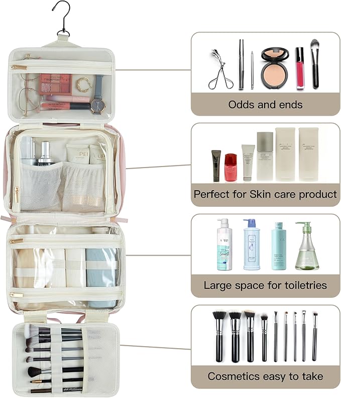 - Multiple Compartments: Equipped with a variety of well-organized sections, including zippered pockets, mesh compartments, and elastic bands to keep toiletries, cosmetics, and small accessories secure and neatly arranged. Features transparent sides that offer a quick and easy overview of the contents.