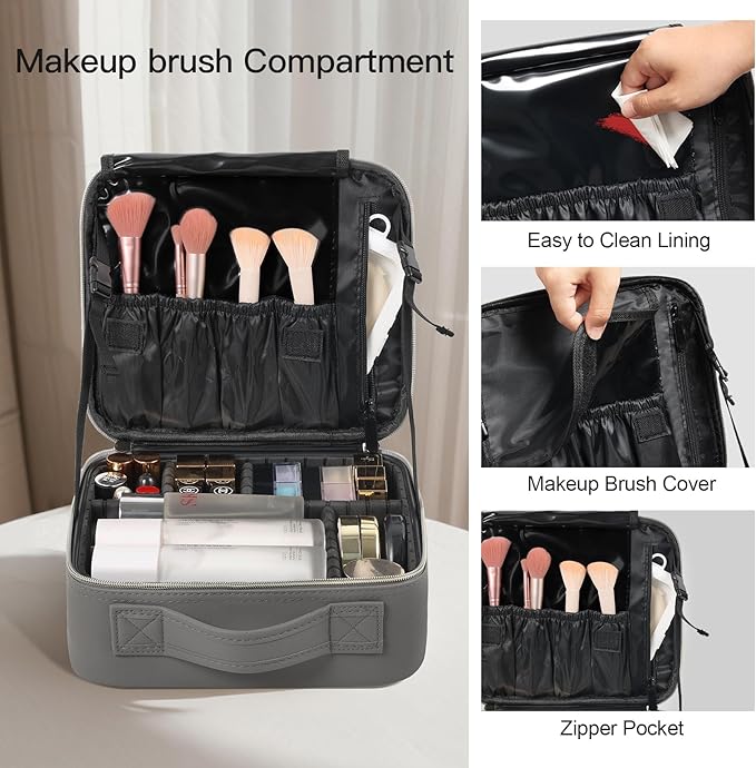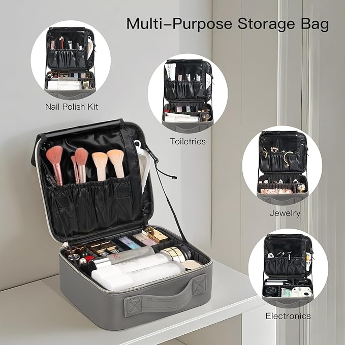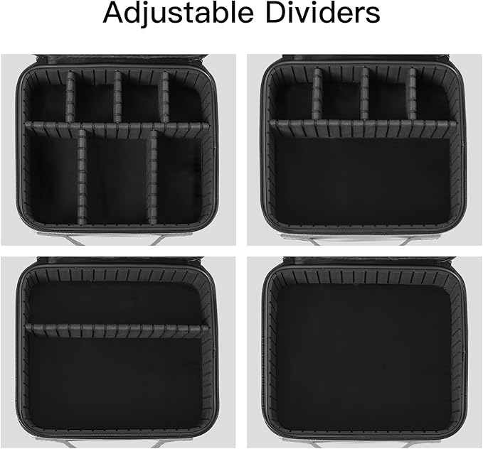 - 【 Adjustable Dividers】This travel makeup case offers 7 versatile compartments, which can be customized using the 6 included EVA dividers. Our makeup travel bag is tailoring the layout to fit your makeup kits, shaving essentials, toiletries, perfumes, essential oils, ID cards, mobile devices, and more, keeping everything neatly organized and easily accessible.