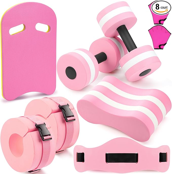 8 Pcs Water Aerobics Set Including Exercise Foam Dumbbells Aquatic Swim Belt Pull Buoy Swim Kickboard Sport Gloves Water Weights Equipment for Aquatic Fitness Weight Loss Fitness Tool