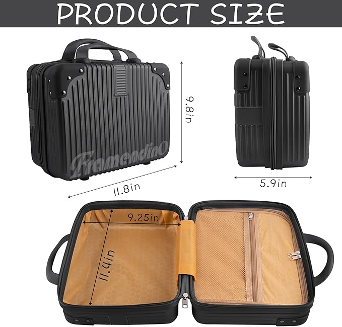 - Size: Portable makeup travel case hand luggage is about 11.8*9.8*5.9*11.4*9.25 inch, capacity is enough for you to put down the cosmetics and toiletries you need for a business trip, traveling, camping