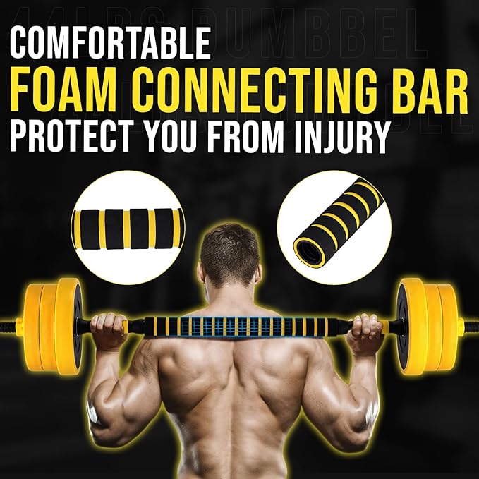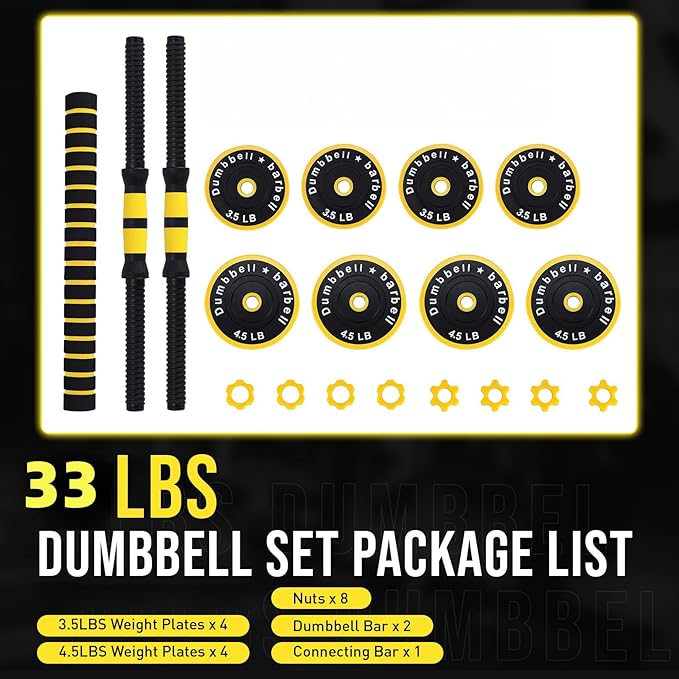 - 33 LB PACKAGE INCLUDED: 4 x 4.5 LB Dumbbell Weight Plate, 4 x 3.5 LB Dumbbell Weight Plate, 2 x Dumbbell Bars, 1 x Connecting Bar, 8 x Nuts.