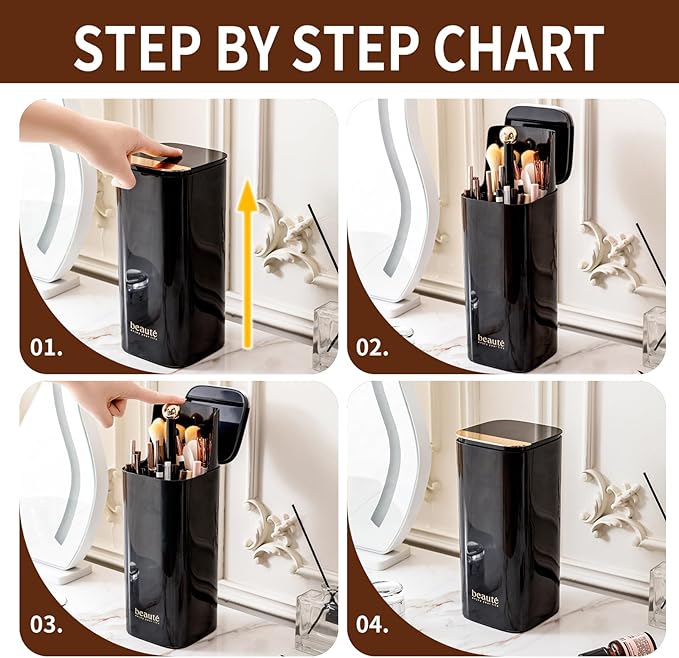 - Exquisite Design, this is a press type makeup brush holder. Simply press the lid lightly to open this makeup brush organizer. You can see that the makeup brush automatically rises and presents itself in front of you. After use, press the middle ball to complete the storage