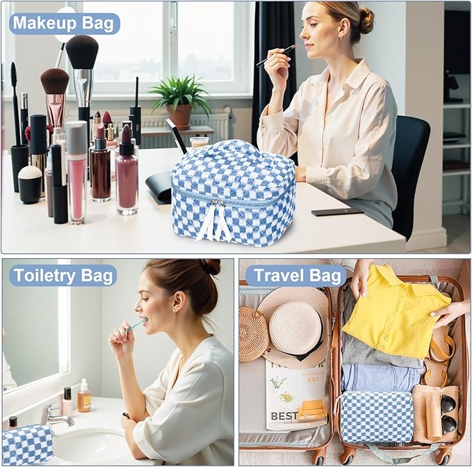 • 【CHECKERED TRAVEL POUCH】Whether you're storing skincare products, toiletries, makeup brushes, electronics, or office, this cotton quilted makeup bag is your perfect companion. It is a great choice for daily use and travel