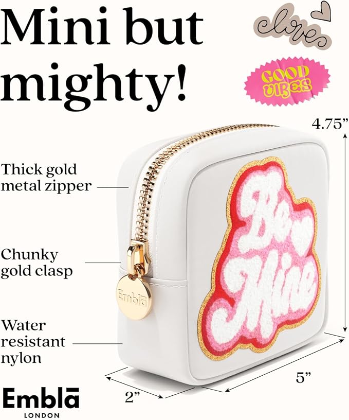 - GIVE THE GIFT OF LOVE AND FASHION with Embla’s new mini cosmetic pouches with chenille patches that express your affection including checkered hearts, XOXO, LOVE, and BE MINE. Ideal present for wife, girlfriend, mom, grandmother, daughter, bridesmaids, teachers, cheer teams, Valentine's Day, Mother's Day, Anniversaries, or Birthdays. Available in Flamingo Pink, White and Ruby Red.