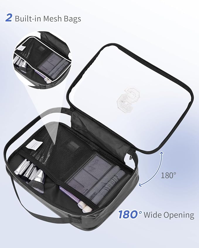 - 【Clear Makeup Bag Easy to Clean】We chose durable Oxford cloth and PVC material to make the bag easy to clean. Even if an inadvertent spill occurs on an airplane, simply wipe it off easily with a warm damp cloth and soap. The transparent PVC fabric allows you to view the contents of the bag at a glance