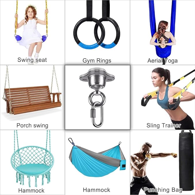 - 【Versatile Use】The punching bag hanger suitable for hanging home and gym punching bags, speed bags, sandbags, as well as indoor and outdoor swings, hammock chairs, porch swings, tire swings, yoga swings, suspension trainers, Olympic rings, gymnastics rings, and fitness rings.