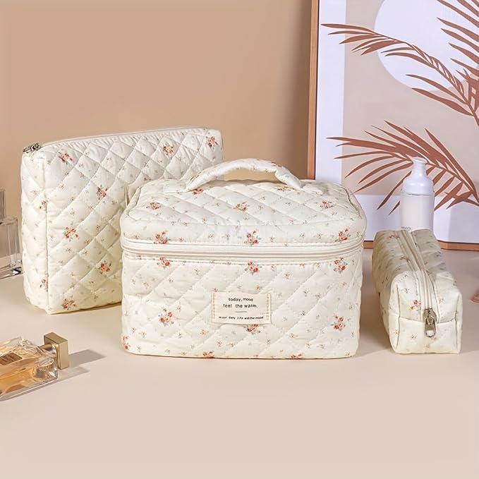 Quilted Cosmetic Bag Set, 3 PCS Cotton Floral Makeup Bags, Makeup Bag Set, Flower Travel Toiletry Organizer Bag, Coquette Makeup Pouch, Large Make Up Bag for Women (Small Flowers)