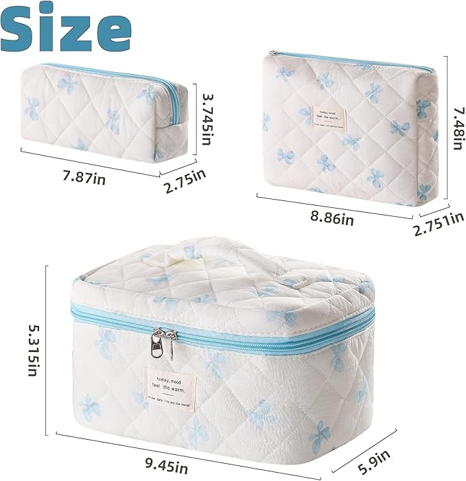 3 Piece Cute Blue Bow Quilted Makeup Bag Set, Large Capacity Travel Makeup Bags for Women and Girls, Includes Small, Medium, and Extra Large aesthetic makeup&Cosmetic Bags (3PCS-Blue Bow)