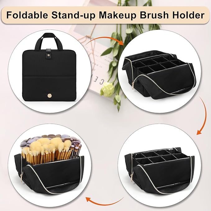 - Standable Foldable: This makeup brush case can easily accommodate various sizes of brushes. Just open the zipper, fold it in half and buckle it up. It can stand independently on the desktop, making it easy to use the brushes.