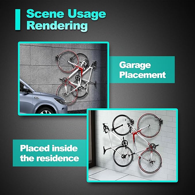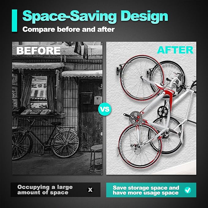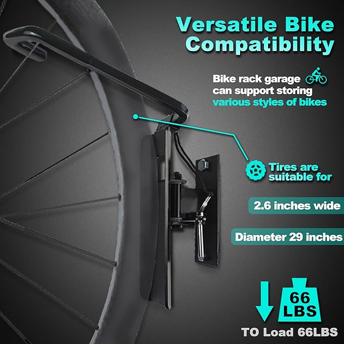- [Multiple Vehicle Models] bike rack garage can support storing various styles of bikes, such as road bikes, mountain bikes, e-bikes, kids' bikes, etc. bicycle wall mount fits bicycle tires up to 2.6 inches wide and 29 inches in diameter. bike hangers for garage each can hang weight of up to 30 kg/66.2 lbs.