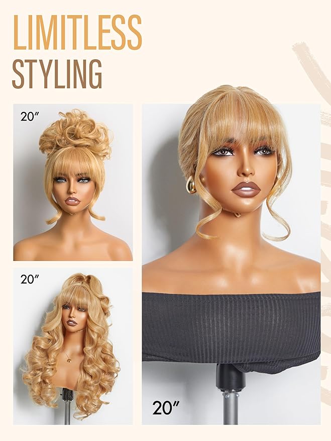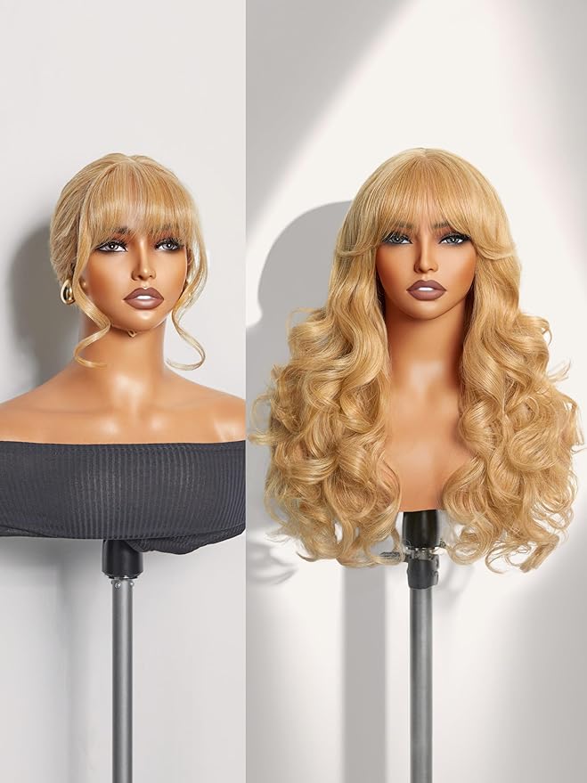 GORGIUS Glueless Wavy Wig with Bangs Honey Blonde Synthetic Curtain Bang Wig with Realistic Scalp 22 Inch