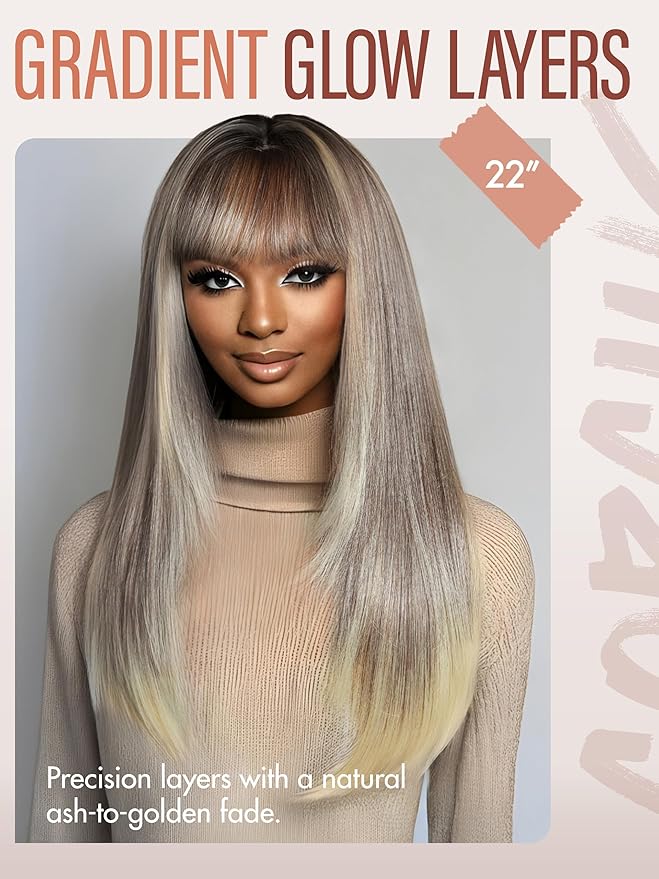 GORGIUS Straight Glueless Wig with Bangs Ash Brown to Blonde Layered Hair Ready-to-Go Synthetic Bang Wigs with Realistic Scalp 24 Inch