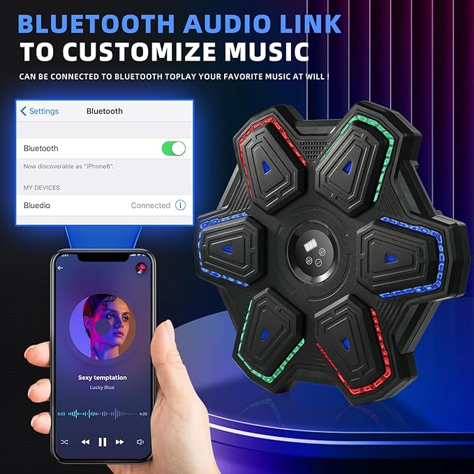 - The LED display screen and Bluetooth will show your click count and record every progress and growth you make. The smart music boxing machine supports Bluetooth music, allowing you to choose your favorite songs during boxing training. Surround speakers and cool lighting immerse you in training.
