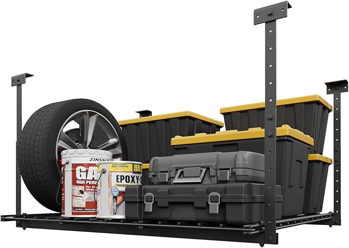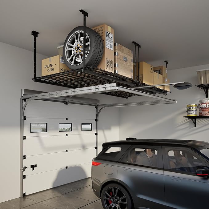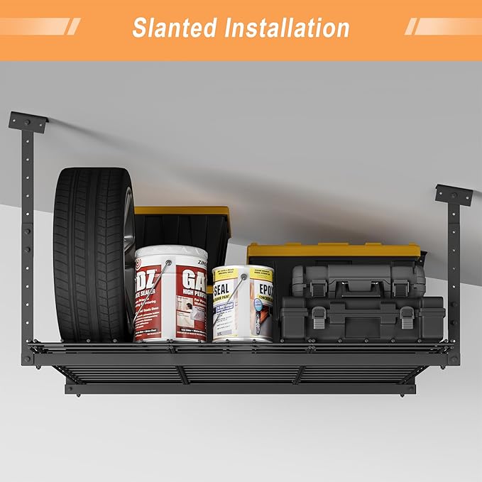 - 🏆【Heavy-Duty 250 lbs Capacity】- Crafted with industrial-grade cold-rolled steel, our garage ceiling storage rack securely holds up to 250 lbs. Perfect for bulky seasonal items, toolboxes and outdoor gear.