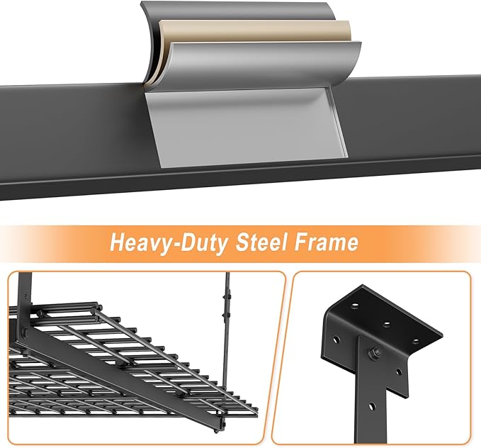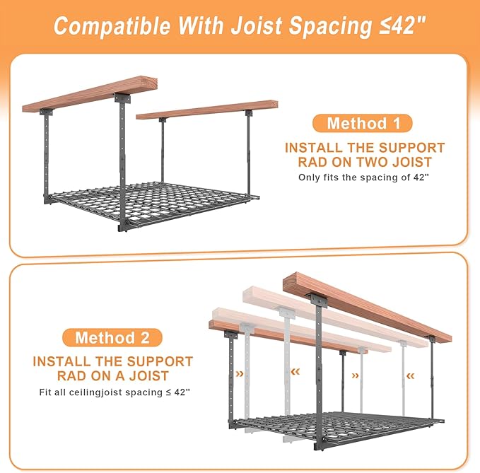 - 🔧【Quick Installation】- On any Ceiling Joists ≤42". Pre-drilled universal mounting brackets work with all standard joist spacing. No complex measurements – install this overhead garage storage rack in under 1 hour using basic tools.