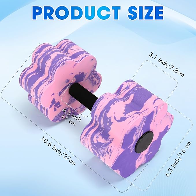 - 🤽♀️ Lightweight/Easy to Grip aqua fitness dumbbells - The dumbbells are lightweight very easy to carry to and from your water workout location. They are also easy to grip - the handles are made of sturdy plastic reinforced with a foam cushion. Dimensions:10.63"L x 6.29"W.