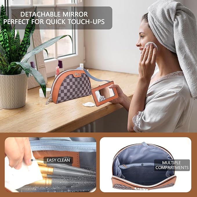 Small Makeup Bag for Purse Cosmetic Bag: Checkered Make up Bag for Women - Cute Preppy Skincare Bags for Evening - Waterproof Travel Pouch for Toiletry Organizer with Mirror & Zipper(020-Brown)