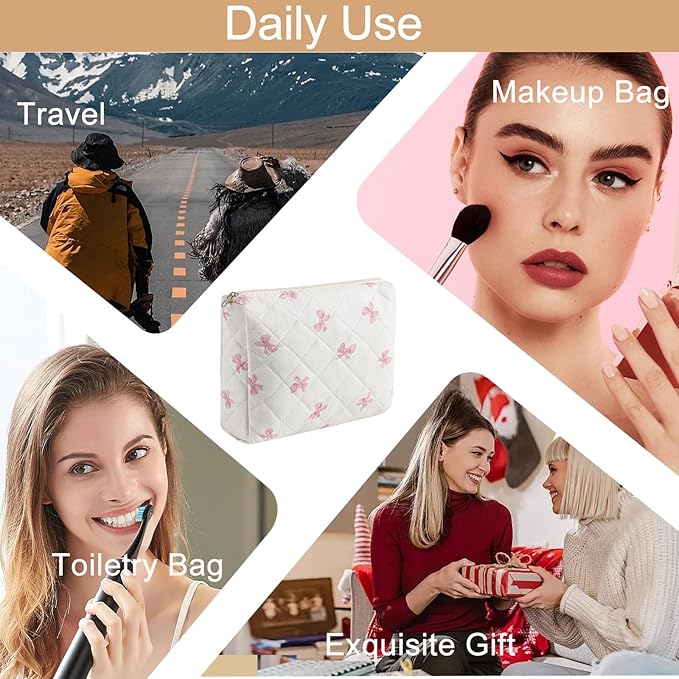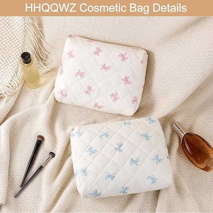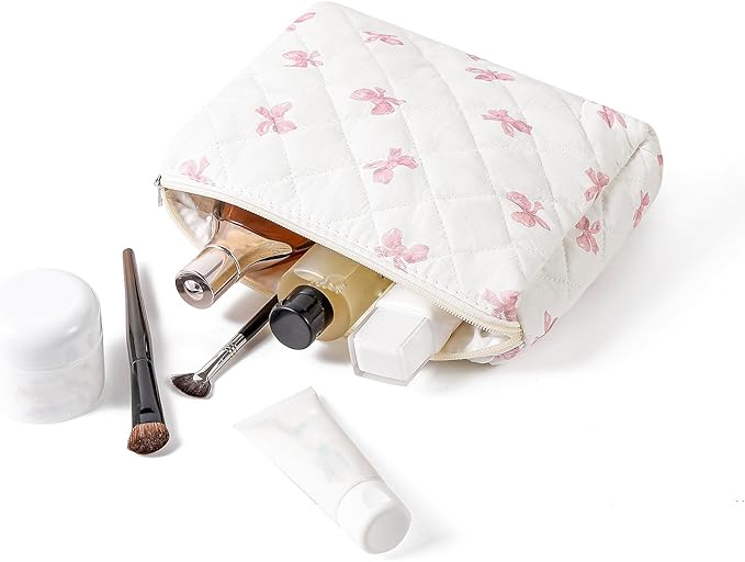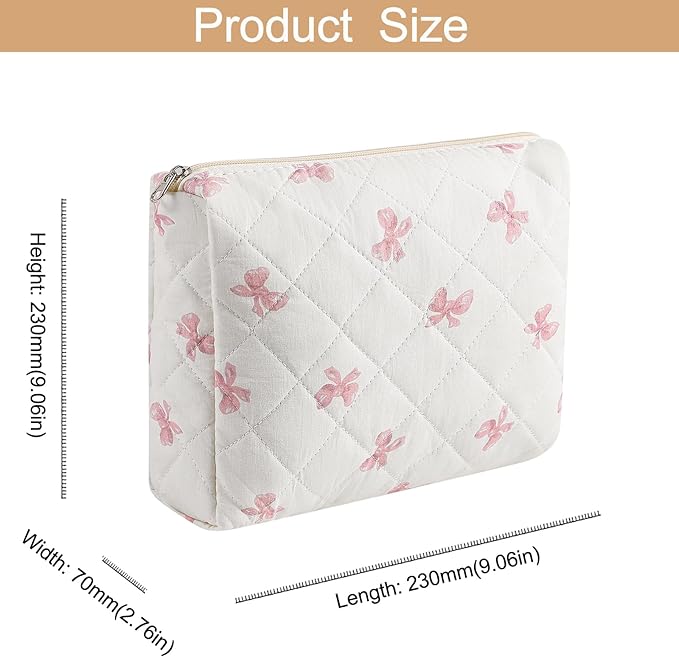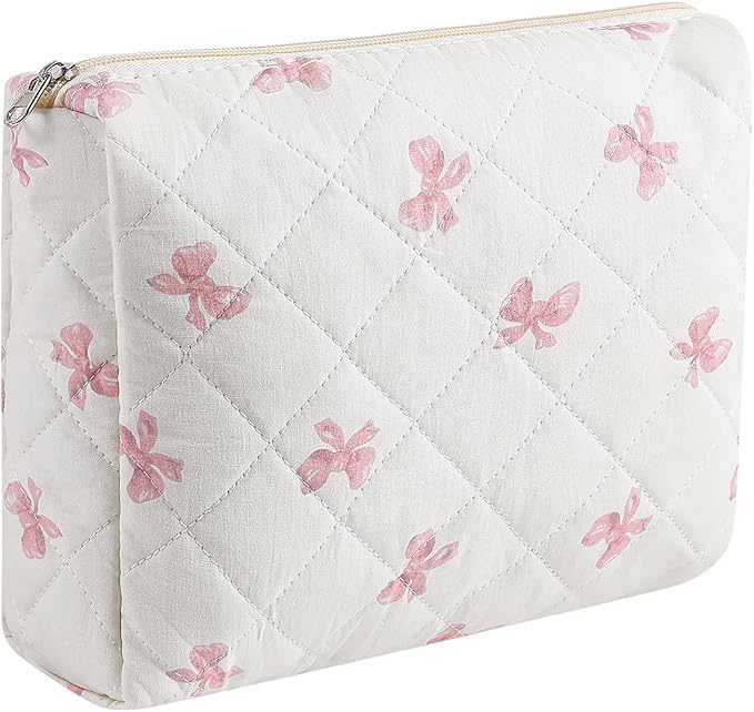 Large Quilted Cotton Makeup Bag Cosmetic Bag for Women, Cute Large Floral Cotton Travel Cosmetic Bag, Zipper Toiletry Bag Makeup Organizer Storage Bag (Pink Bow Tie)