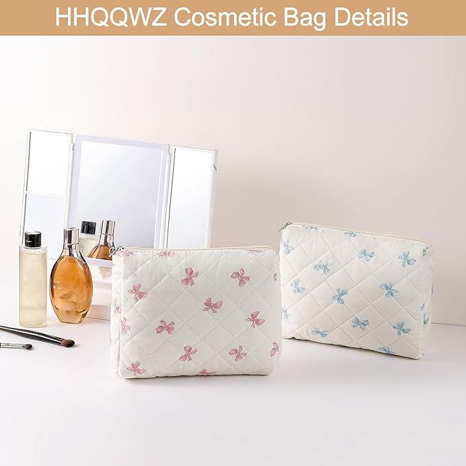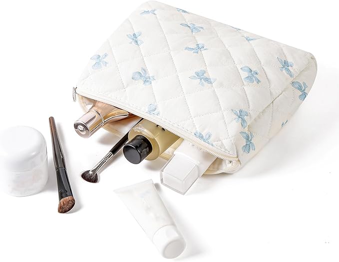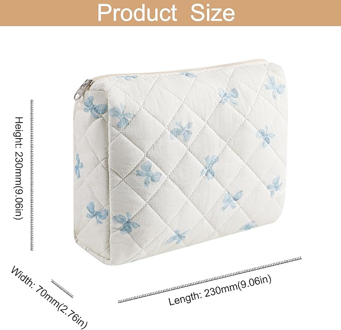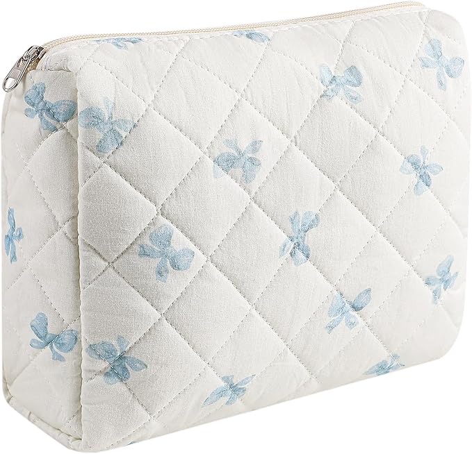Large Quilted Cotton Makeup Bag Cosmetic Bag for Women, Cute Large Floral Cotton Travel Cosmetic Bag, Zipper Toiletry Bag Makeup Organizer Storage Bag (Blue Bow Tie)