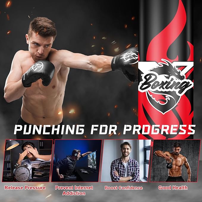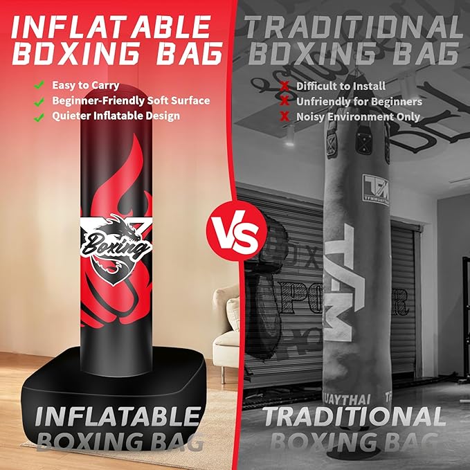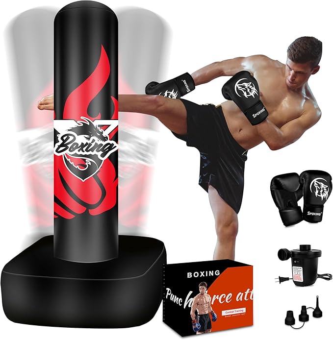 - Upgraded Boxing Punching Bag Set: Our boxing training equipment includes a free-standing punching bag, a pair of boxing gloves, and an electric air pump. No need to purchase an extra pump—it's easy to inflate, saving you time and effort. The gloves feature thick padding and an adjustable wrist strap design, offering top-level protection for your hands, so you can punch with confidence and power