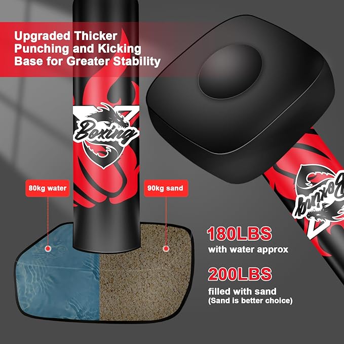 - Stable Large Base Boxing Bag: The thickened base can securely support up to 80kg of weight, holding 180 lbs of water or 200 lbs of sand. Before using the punching bag, ensure the base is fully filled with water/sand and inflated with an air pump. You can choose a single material or a mix of both to enhance stability. Sand is an excellent choice for added sturdiness